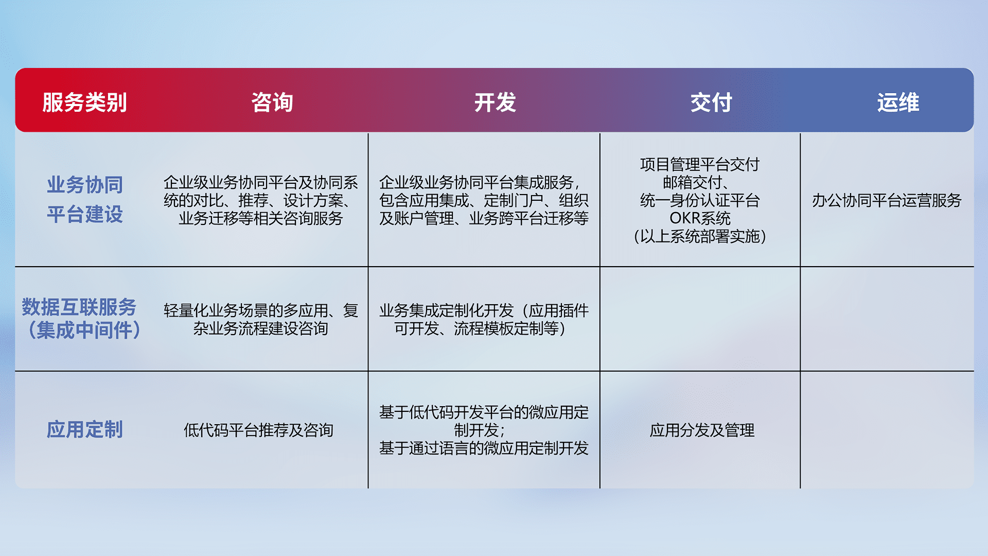 针对钉钉、、、企微、、、IDaas等平台级产品提供产品的规划、、、、方案、、交付、、、、定制化开发等服务,,,,实现如统一协同办公、、智能客户服务、、、、混合会议管理、、智能数据查询、、等业务场景,,,,实现数字化转型。。。